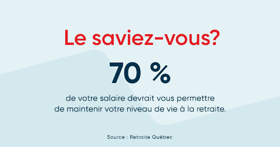 En règle générale, vous devez disposer de l’équivalent de 70 % de vos revenus annuels bruts de travail pour maintenir votre niveau de vie à la retraite. Mais chaque cas est unique : votre conseiller identifie vos besoins réels avec vous selon vos objectifs de vie.